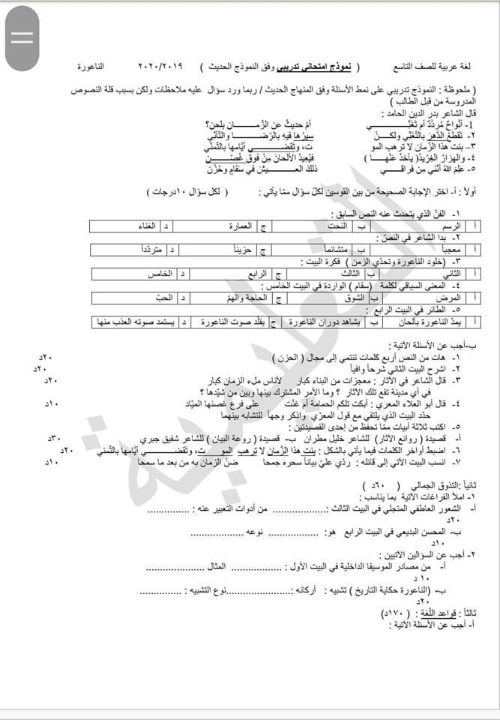 نموذج امتحان في اللغة العربية للصف التاسع الفصل الاول المنهاج الحديث 2019 2020