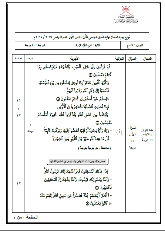 نموذج إجابة امتحان الصف التاسع في التربية الاسلامية الفصل الدراسي الاول 2016 2017